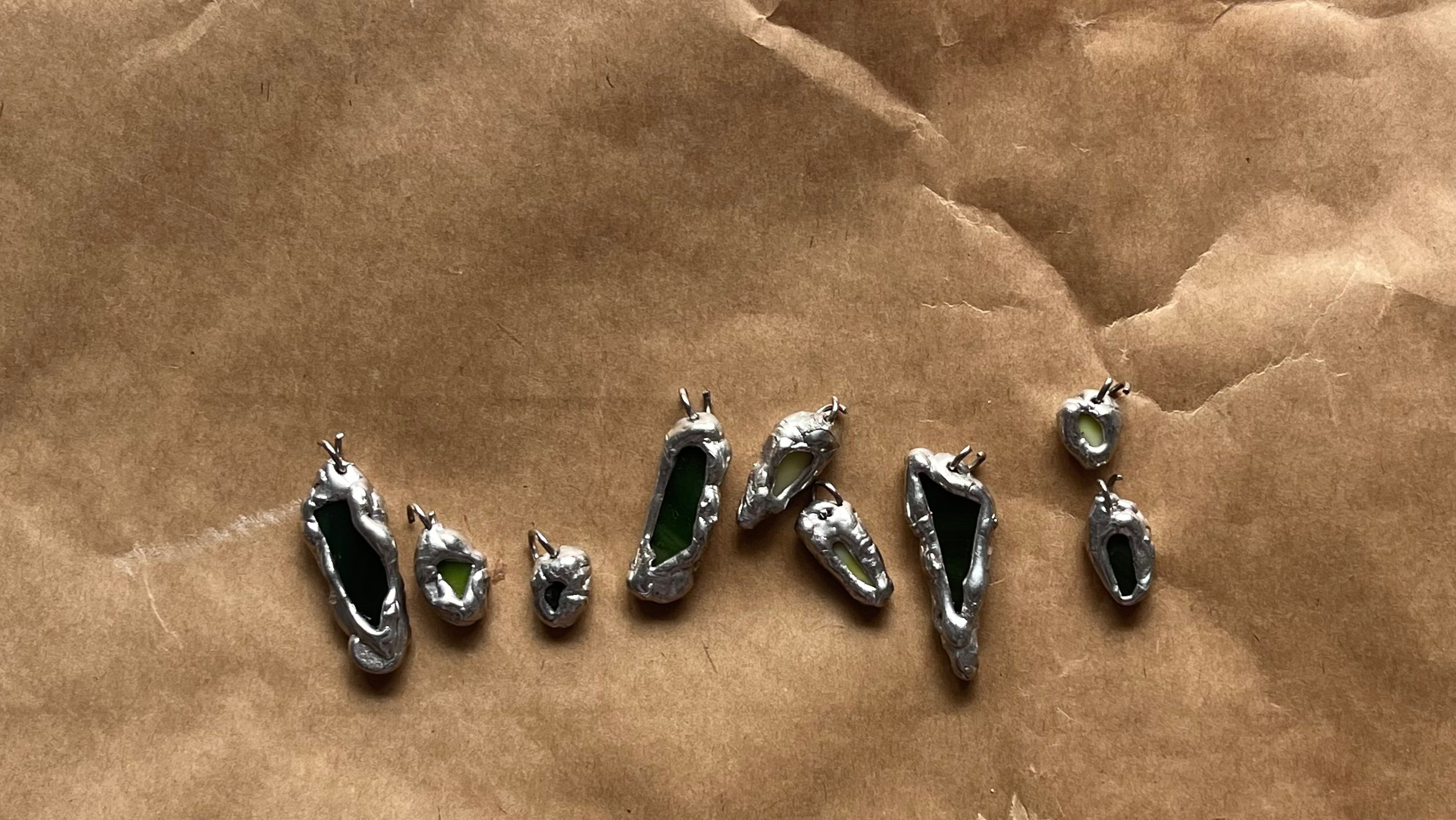 56 piezas únicas de joyería artesanal en vidrio y estaño, trabajados a mano con técnica Tiffany.